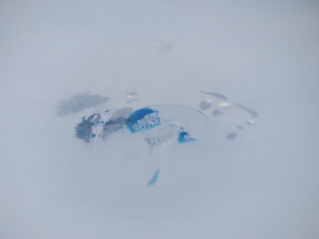 Nunataks mit supraglazialem See und Spalten im Inlandeis. |