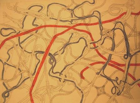 Peter nimmt sein Leben synästhetisch als Reise auf einer Straße durch Landschaften wahr. Über diese Wahrnehmung transportiert er Gefühle. Außerdem speichert und ruft er so seine Erinnerungen ab. Straßen sind auch das Thema seiner Zeichnungen, Bilder und Fotos - seine Straßenwelten.![]() Straßenwelten: Autobahnen und Schienen mit roten und blauen Routen. |